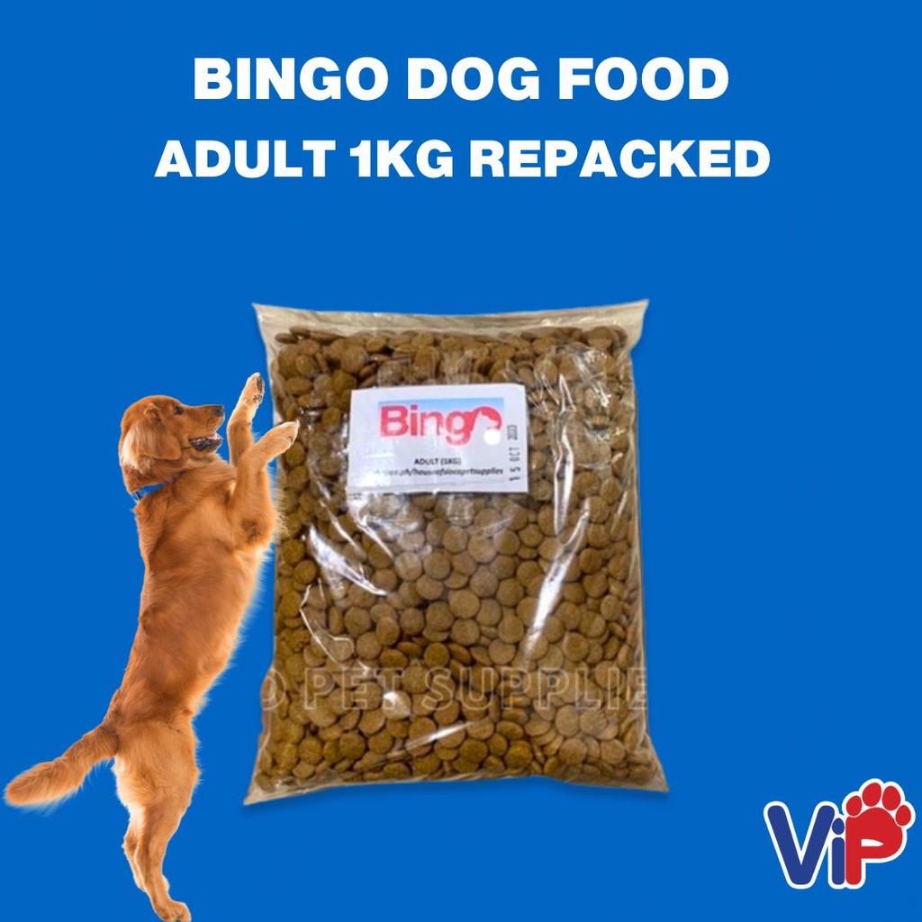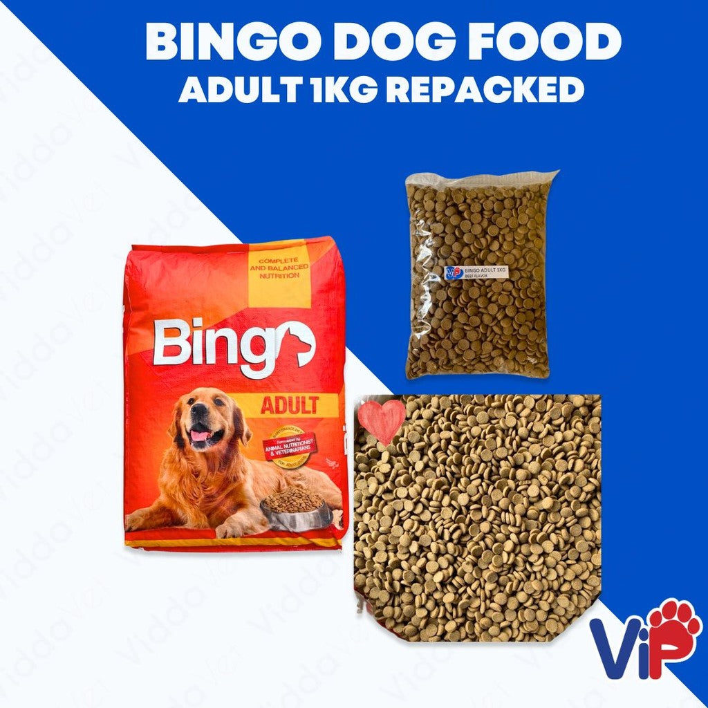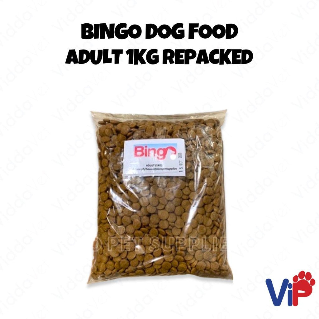 1 bag of Bingo Adult Dog Food (1kg repacked) with feeding guidelines