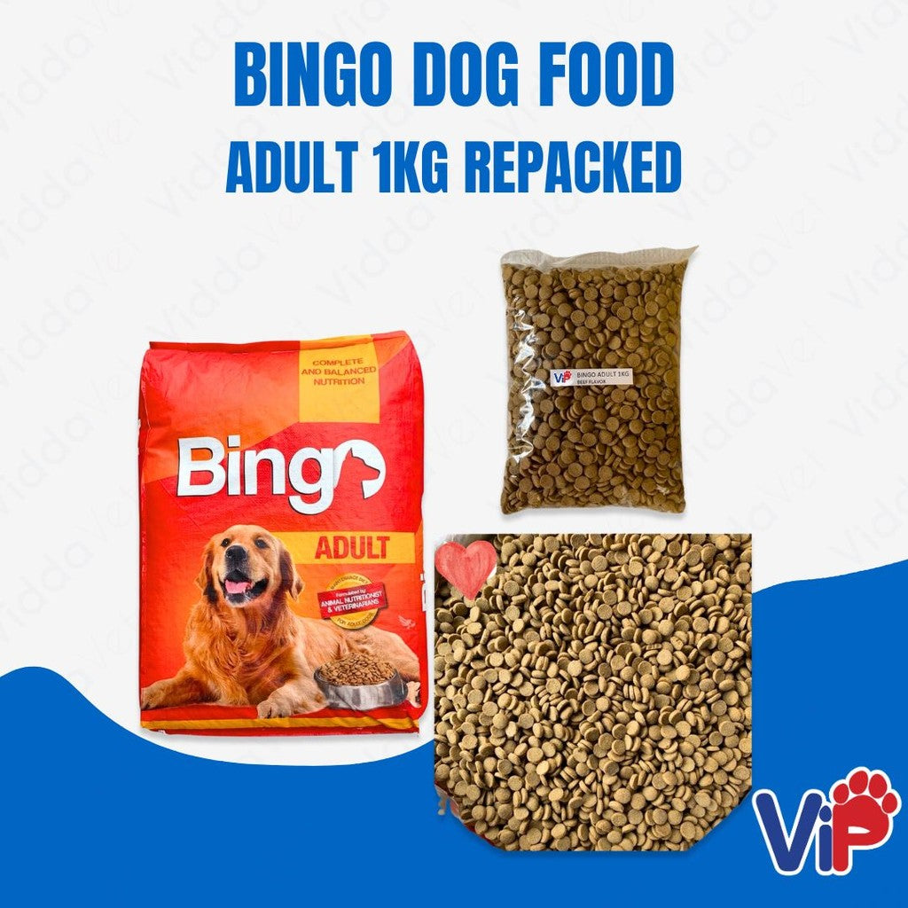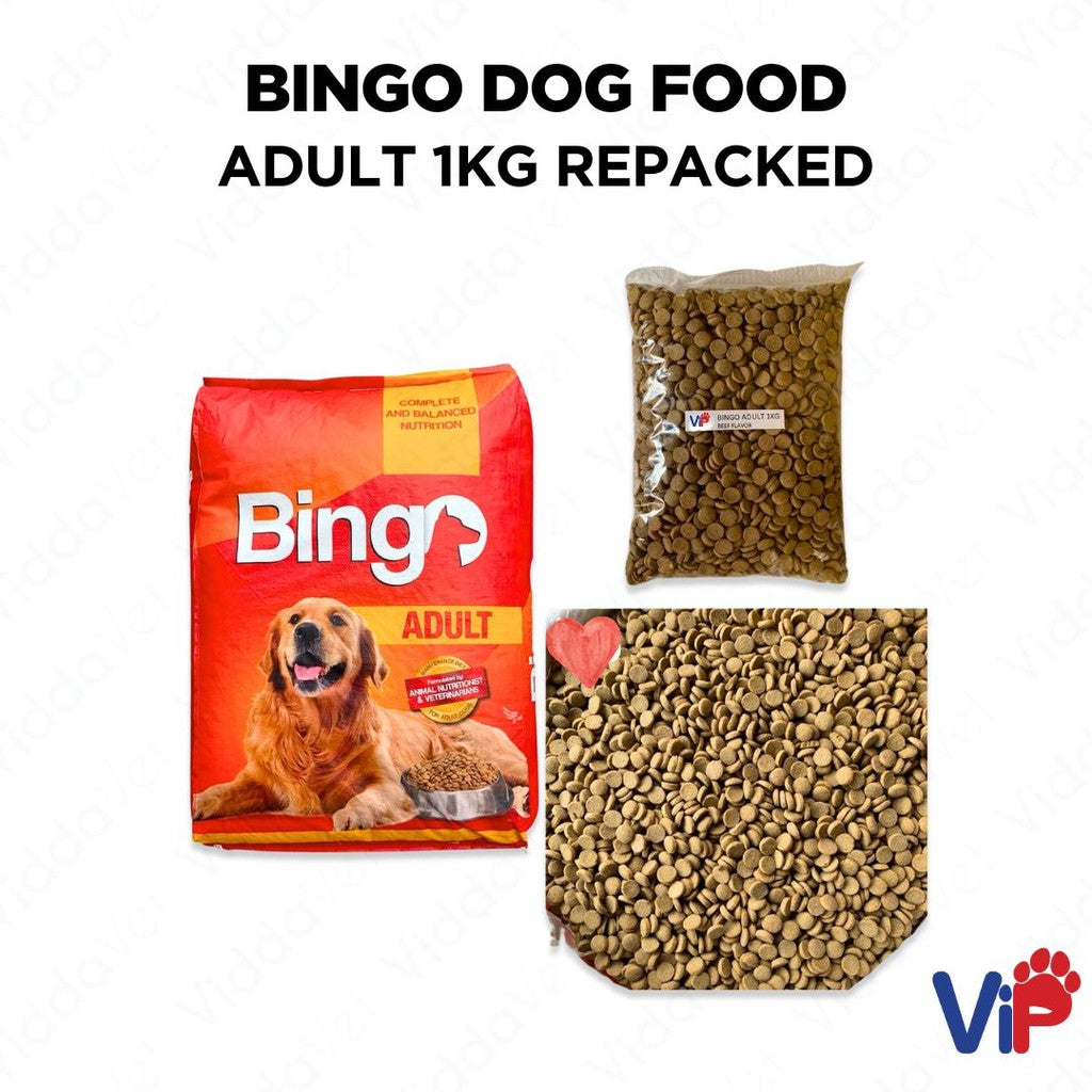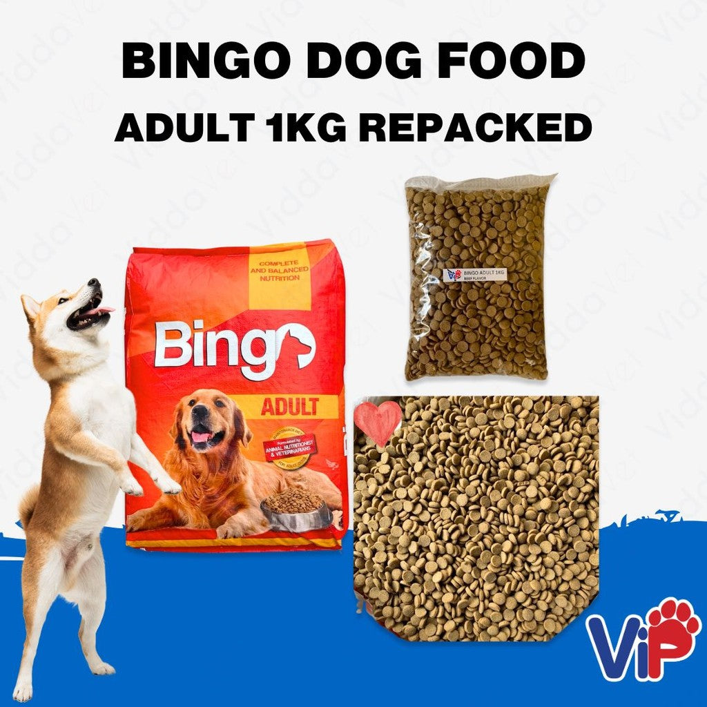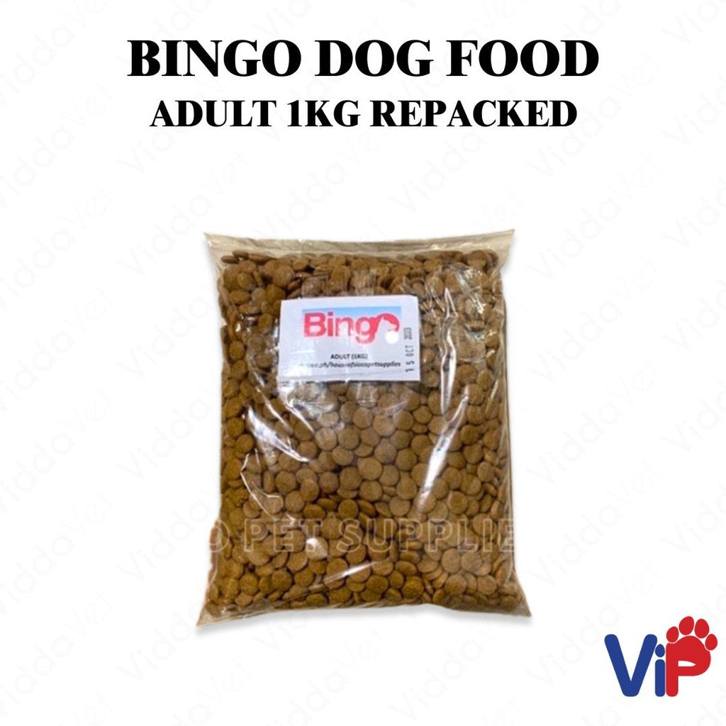 1 bag of Bingo Adult Dog Food (1kg repacked) with feeding guidelines