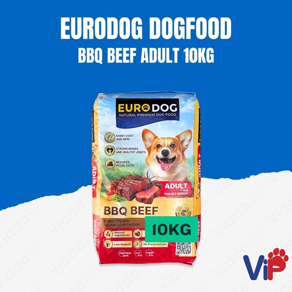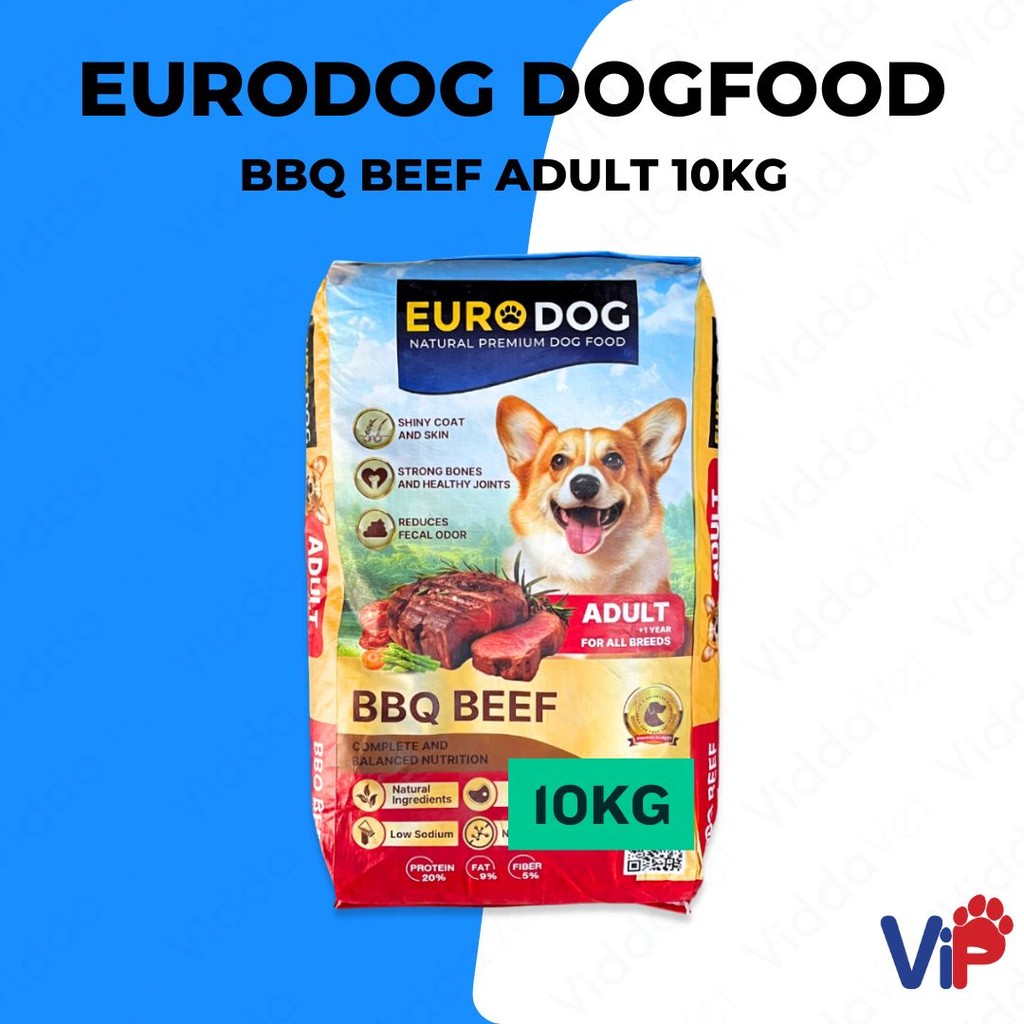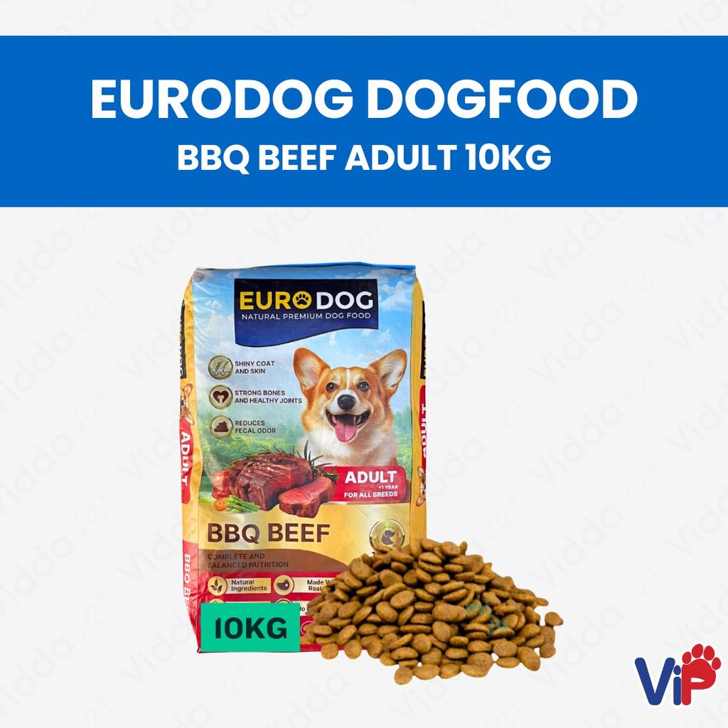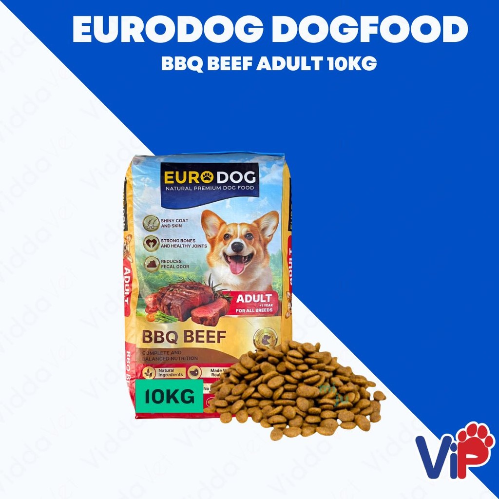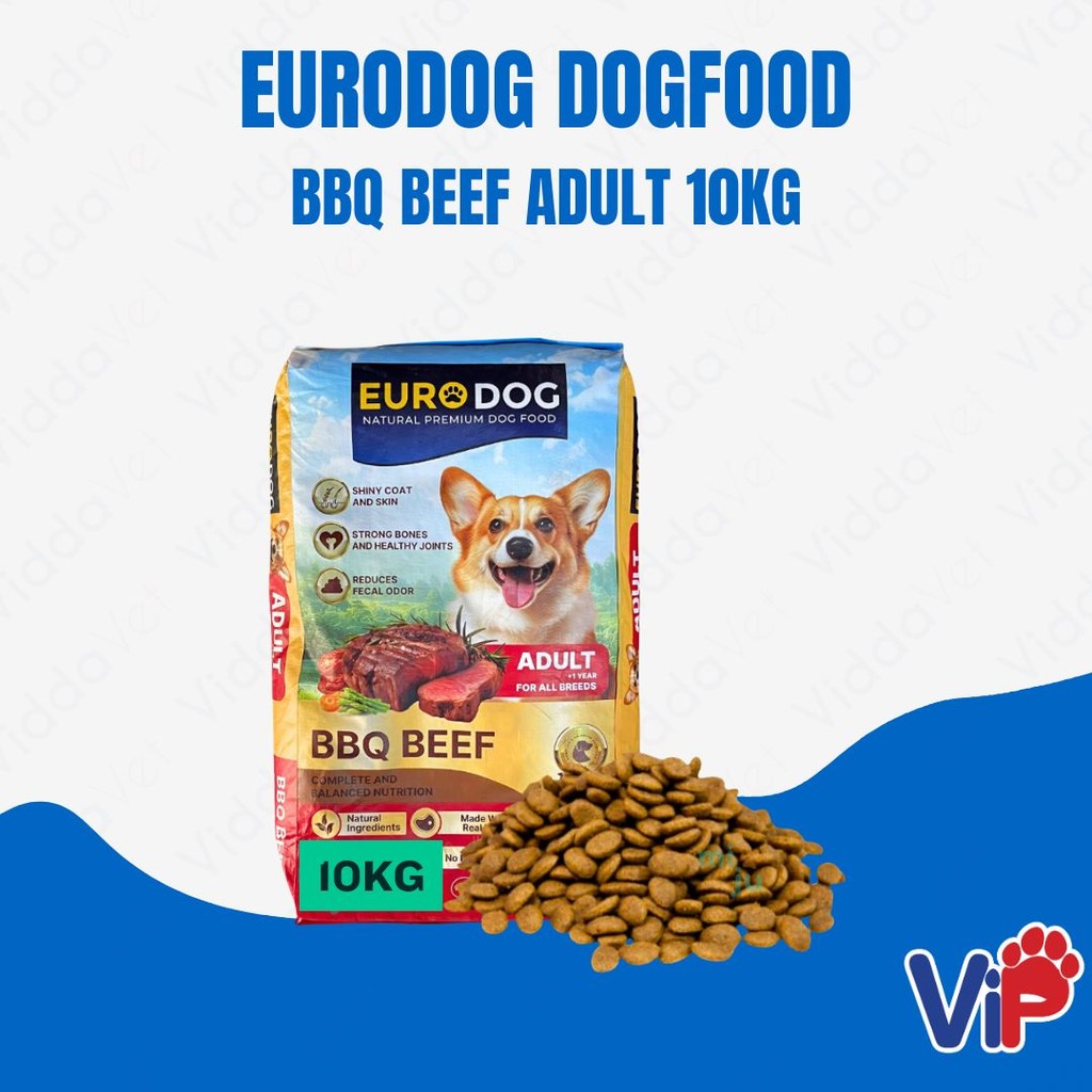 1 bag (10kg) of Euro Dog BBQ Beef Adult Dog Food with feeding guidelines